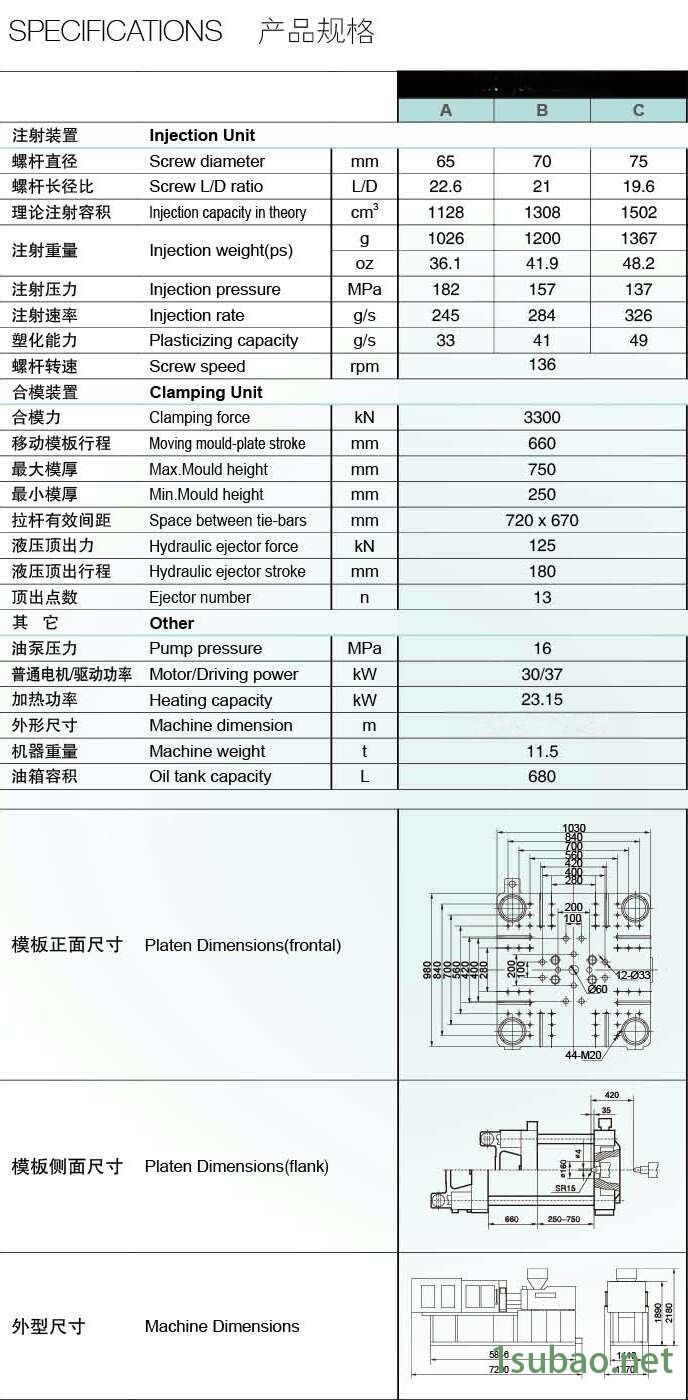 | 電動機功率: | 30 / 37kW | 合模力: | 3300kN |