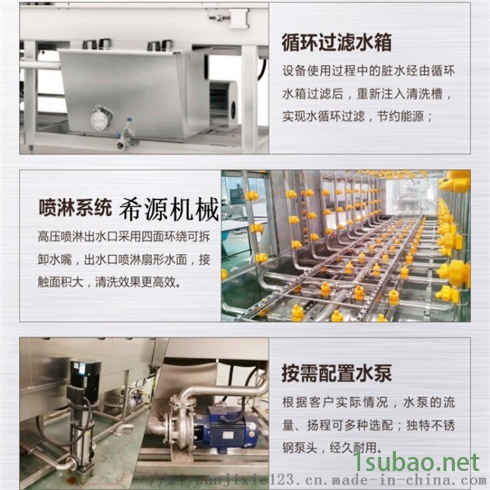 清洗分為三段 段為熱堿水, 段為熱清水, 段為自來水。三段噴淋水除 段自來水外都有獨立循環過濾水箱, 段自來水作為補充水回收至 段水箱加熱使用過后部分污水被自動排出。 水箱內設有蒸汽加熱管,溫度從常溫至100°C自由設定、自動恒溫。公司標配設置一般為 段水泵功率1.5KW, 段水泵功率5.5KW, 段水泵功率0.75KW,輸送帶電機功率0.75KW,輸送速度3-15m/min可調。(具體參數根據客戶實際情況專門設計制作生產,此參數只做參考);